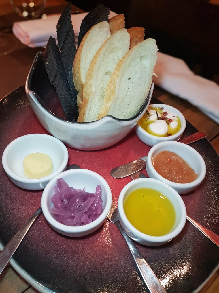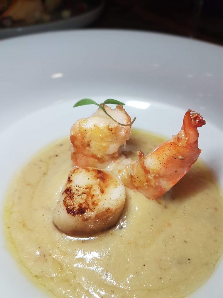 Pedimos o couvert para experimentar e o que eu mais gostei, sem dúvida nenhuma, foi o azeite com flor de sal na torradinha. As cebolas caramelizadas estavam bem saborosas também. De entrada eu fui de Camarão com vieira, creme de castanha e palmito pupunha (perfeito!) e o mozão foi de Tostada de polvo ao vinagrete de maçã verde e hortelã. Experimentei e estava bem delícia também, mas meu camarão com vieira foi imbatível! 🙂