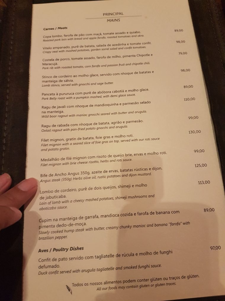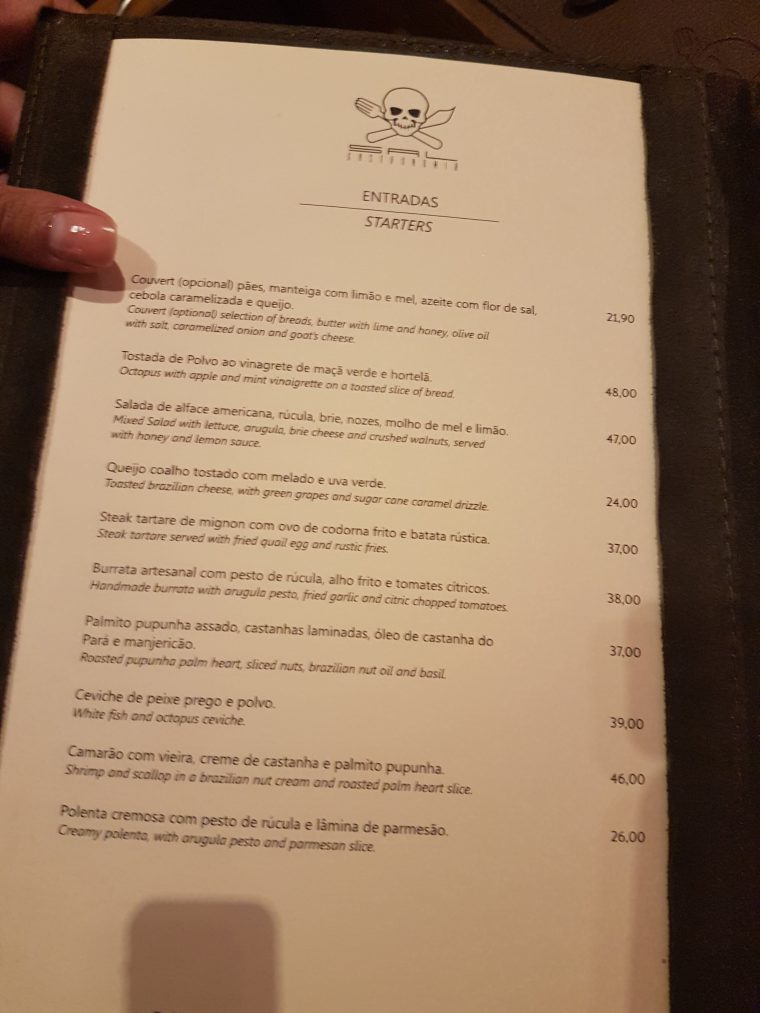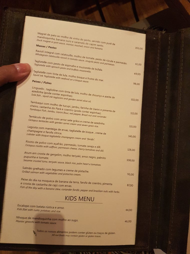 Vamos ao cardápio. Na minha opinião, muito criativo e variado. Os preços são altos, mas vale muito pelo serviço, ambiente e qualidade dos pratos que encontramos por lá. Tinha até Tambaqui, um peixe que normalmente só se encontra na Amazônia. Quero dizer que é mais comum nessa região e bem mais difícil por aqui, eu nunca vi no Rio. Se vocês já viram em outro restaurante, deixem comentários!