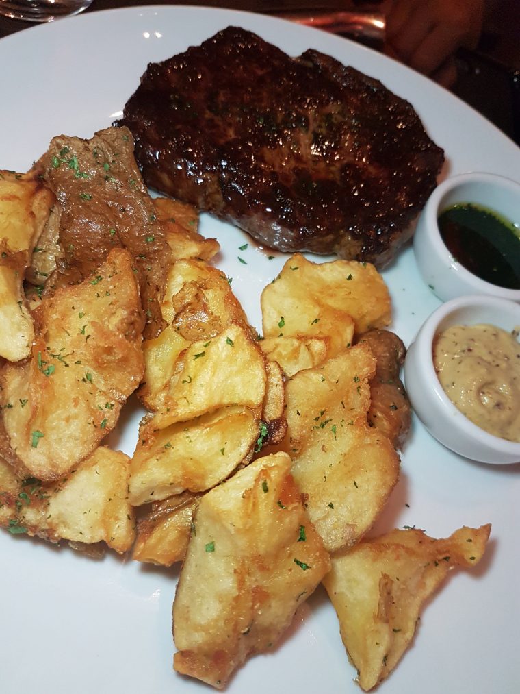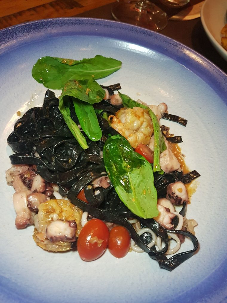 De principal, fiquei na dúvida de muitos, adoro ver cardápio que gosto de tudo o que tem nele. Quase pedi o Tambaqui, mas acabei optando pelo Tagliatelle com tinta de lula, molho bisque e frutos do mar, porque estava numa batida forte vindo de Búzios só comendo frutos do mar, aí quis continuar pra não perder a prática, só porque amo muito. E não me arrependi. O mozão, português amante de carne e batatas, foi de Bife de ancho Angus com batatas rústicas, claro. Também dei uma mordiscada no dele e a carne estava muito saborosa e macia.