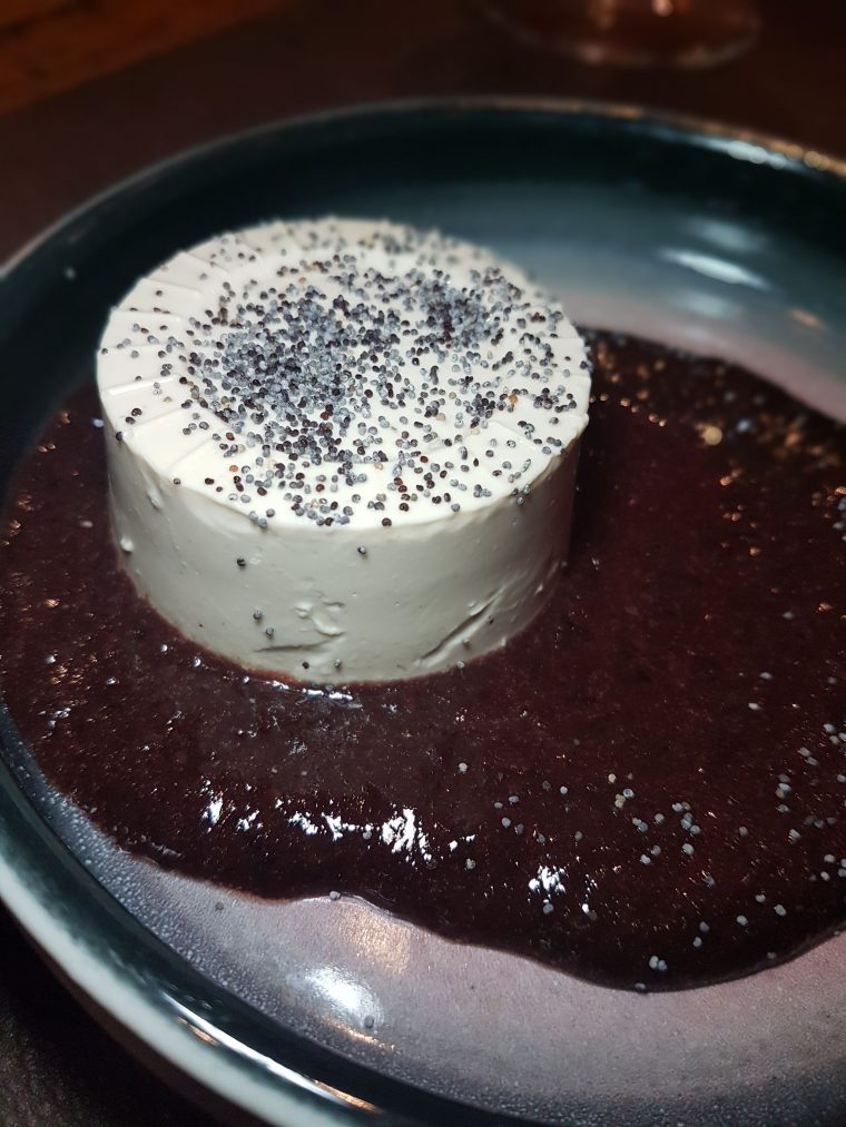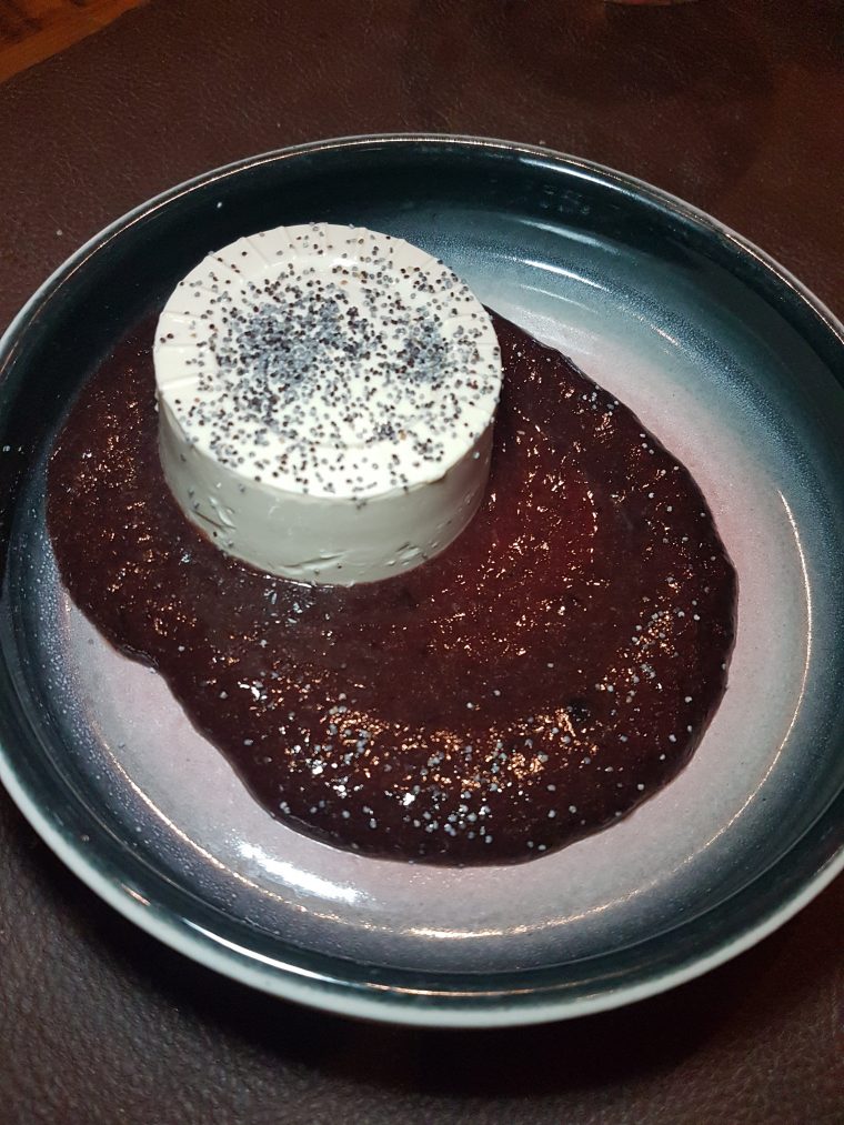 Pra finalizar, pedimos uma sobremesa mais exótica, que era destaque da casa, o Pudim de cumaru com calda de frutas vermelhas e sementes de papoula. Confesso que foi bem diferente, estranhamos um pouco o sabor, estava bom, mas muito doce. Como eu não sou chegada a sobremesas muito doces, achei que as frutas vermelhas dariam uma quebrada, porém ficou muito doce mesmo assim (pro meu paladar). Mas era bem gostoso, sugiro dividir por dois para não ficar enjoativo!