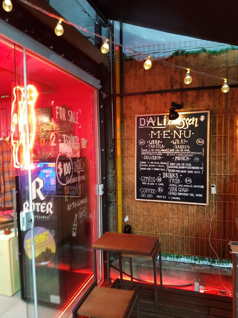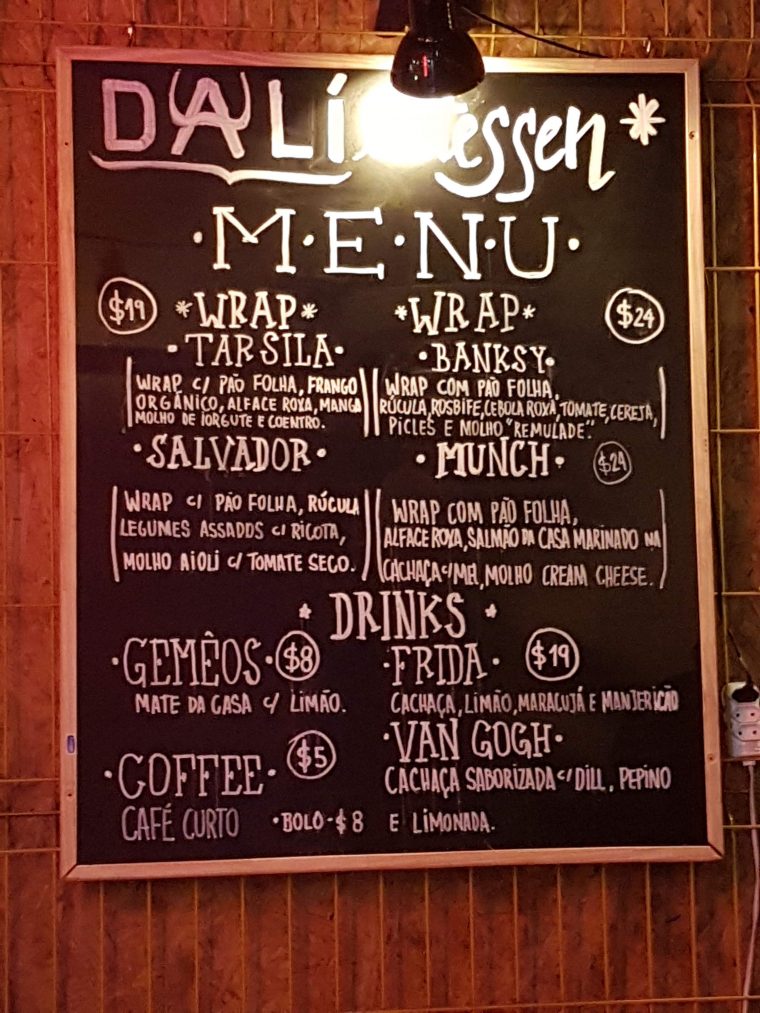Assim que cheguei já parei no pequeno café que fica na entrada – o DALÍcatessen – que é um charme e as meninas uns amores, tudo veg mas com muito sabor, do que jeito que eu gosto. Experimentei dois tipos de wraps: o Banksy e o Salvador, muito saborosos, que delícia (veja no quadro da foto a seguir). E os bolos caseiros, fofinhos e diferentes? Receitas da norueguesa Janeth (não sei se escrevi certo), que dá vontade de não parar mais de comer! Também o de cenoura… meu Deus! Certamente eu encomendaria um bolo desses todos os dias se morasse ali perto! Ela explicou a receita (vai lá fazer uma visita e conferir), ingredientes saudáveis, e sempre tem dois sabores no dia. Ah, experimentei também, pela primeira vez, o Nordic Kombucha, refrigerante que atua como probiótico, tem vários sabores e é bem refrescante. Fui no de limão e gengibre, adorei!