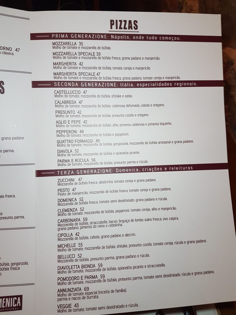 No cardápio, as 24 pizzas são divididas em três seções: Prima Generazione (clássicas), Seconda Generazione (especialidades regionais da Itália) e Terza Generazione (criações e releituras da casa), com faixa de preço entre R$ 35 e R$ 69.